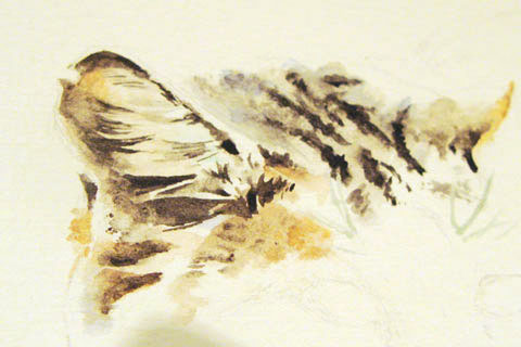 Je poursuis cette aquarelle par morceaux, prenant soin de ne mouiller que les zones à peindre afin d'éviter que le papier ne gondole trop par de fréquents mouillages.
