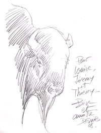 Rencontre mystérieuse entre nature sauvage et civilisation, le regard de l'animal est vif et semble dire « Homme, qu'as tu fait de moi, de ma liberté ...». L'émotion est palpable, on sait l'instant unique et l'on retient sa respiration alors que DERIB en quelques coups de crayons, ... termine la dédicace d'un superbe bison.